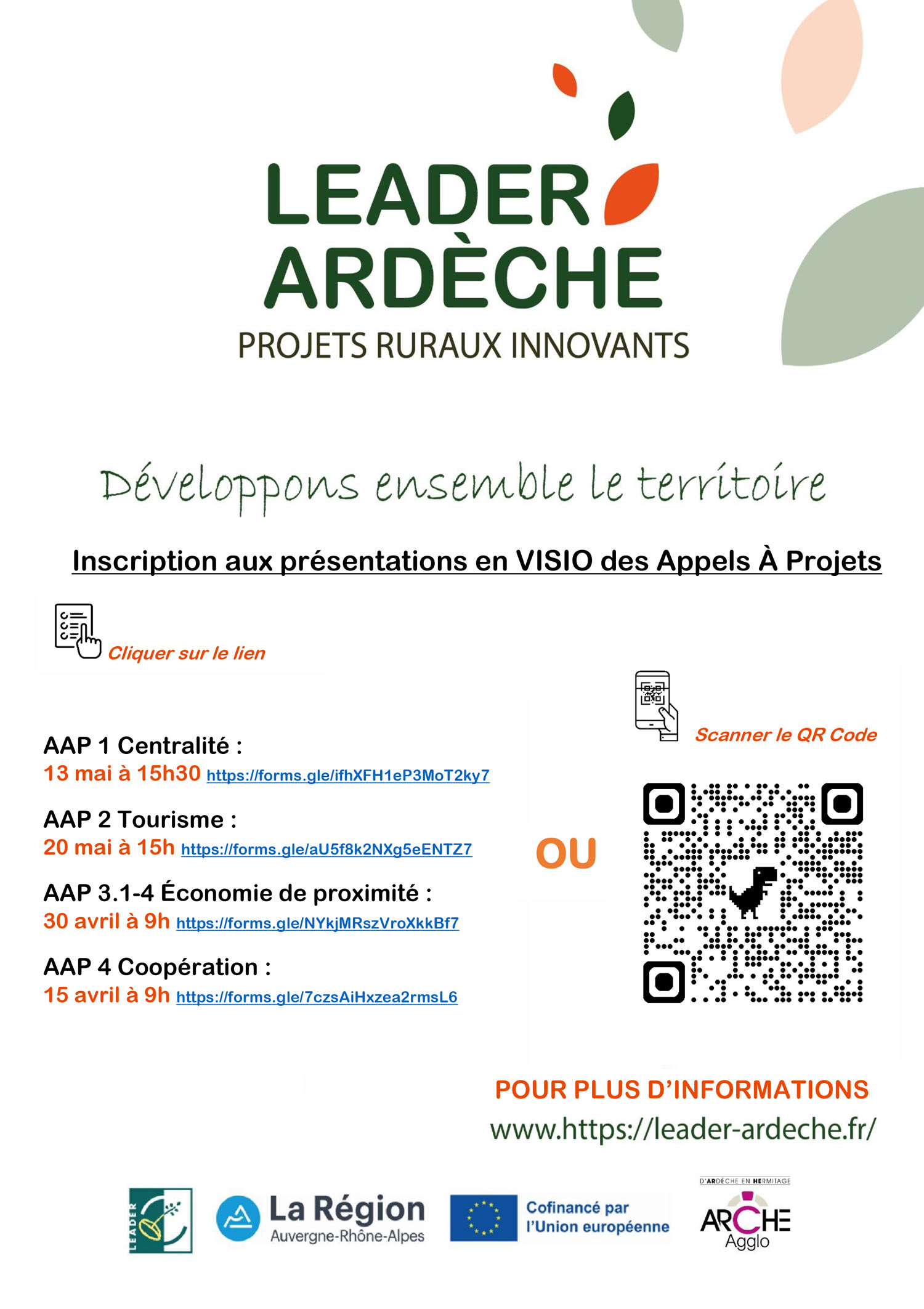 Tous les appels à projets sont téléchargeables sur le site LEADER Ardèche suivants: https://leader-ardeche.fr/ . Les intéressés sont invités à s’inscrire via le lien sous chaque session, un lien visio sera envoyé aux personnes inscrites.