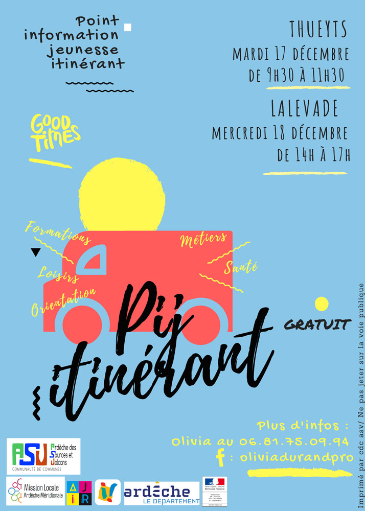 Ouvert à tous et gratuit, le Point Information Jeunesse Itinérant a pour mission d’aider les jeunes à trouver des informations sur tous les sujets qui les concernent ou les intéressent. + d’info