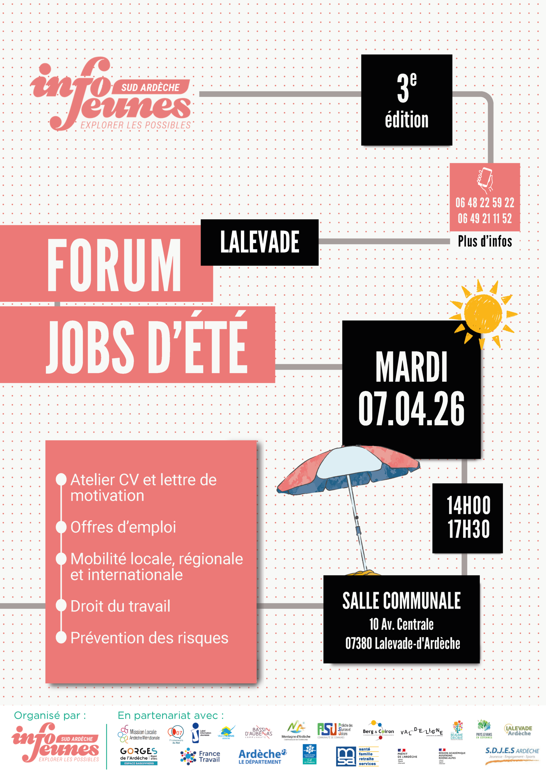 La 3ᵉ édition du Forum Jobs d’été se tiendra le mardi 7 avril 2026 de 14h00 à 17h30 à Lalevade-d’Ardèche.