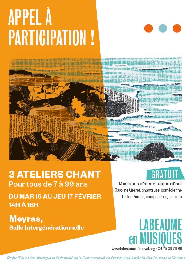 Dans le cadre de l’engagement de la communauté de communes Ardèche des Sources et Volcans en matière d’éducation artistique et culturelle, Labeaume en Musiques propose un cycle de rencontres et d’ateliers autour de la création de Didier Puntos.