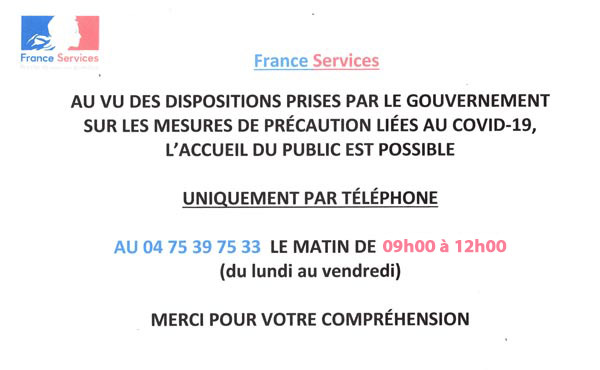 AU VU DES DISPOSITIONS PRISES PAR LE GOUVERNEMENT SUR LES MESURES DE PRÉCAUTION LIÉES AU COVID-19, L’ACCUEIL DU PUBLIC EST POSSIBLE UNIQUEMENT PAR TÉLÉPHONE : AU 04 75 39 75 33 LE MATIN DE 09h00 À 12H00 (du lundi au vendredi) MERCI POUR VOTRE COMPRÉHENSION