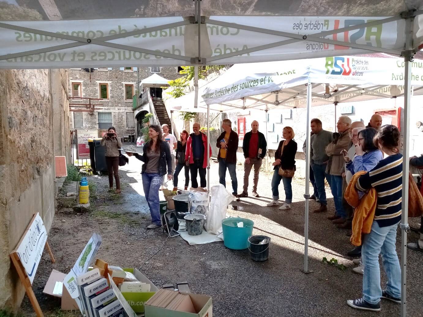 Chaque atelier a été introduit par Pierre Chapuis, vice-président de la communauté de communes en charge du PLUi, laissant la parole à Bernard Leborne, Président de Maison Paysannes d’Ardèche, pour une conférence sur les techniques constructives traditionnelles et les usages de la chaux. Sabine Guidubaldi, architecte conseil au CAUE, a ensuite présenté les fiches architecturales suivie d’une lecture de la façade du bâtiment de l’écomusée du moulinage. Puis, une démonstration et initiation aux enduits de chaux, sur le bâtiment de l’écomusée, a été animé par Virginie Bachelet, spécialiste de la rénovation de maisons anciennes. En parallèle, des stands d’information des entreprises l’Art d’Eco bâtir, Chaux de Saint Astier, et de France Rénov’ – Rénofuté étaient présents, l’occasion d’échanger avec des professionnels.