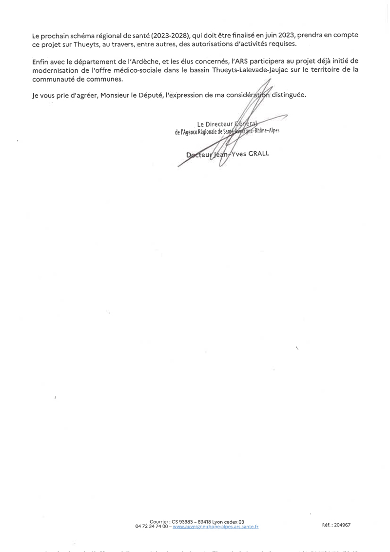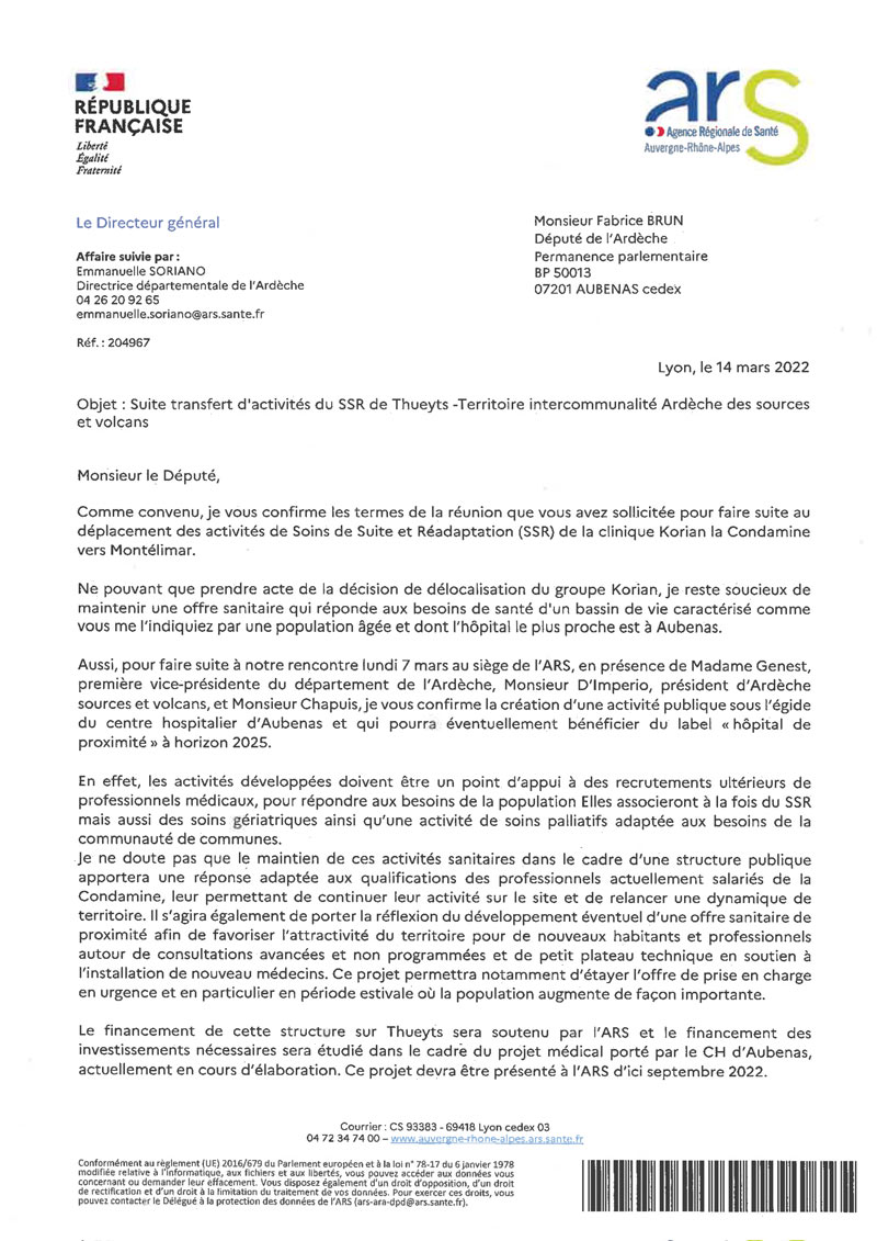 Aujourd’hui, le courrier de l’ARS est une première victoire importante pour la sauvegarde de l’activité et des 46 emplois sur Thueyts. Le Directeur de l’ARS a ainsi confirmé ses paroles du 7 mars à Lyon, par un écrit précis. Nous devons maintenant rester vigilant pour que ce beau projet de création d’un hôpital public de proximité puisse voir le jour et ainsi remplacer l’activité privé de KORIAN…..
