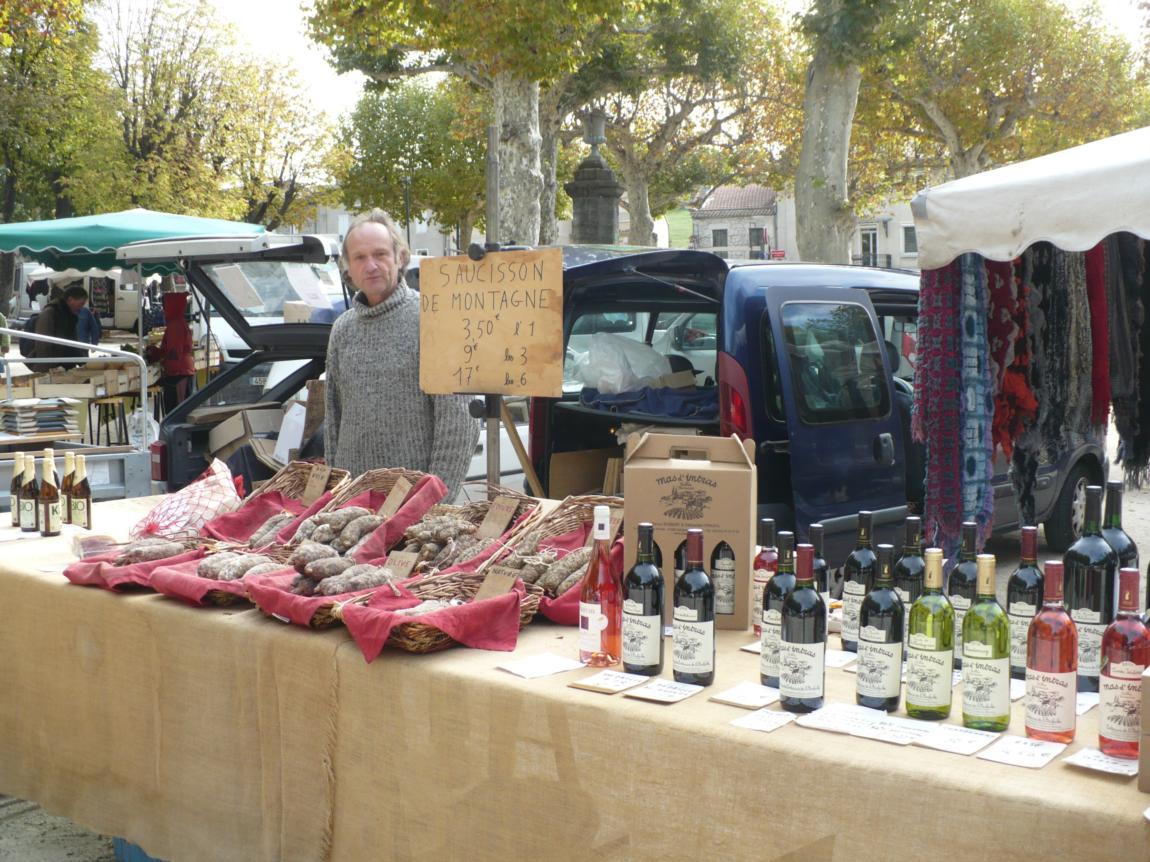Commerce de détail sur les marchés. Vente de vins & saucissons de pays.