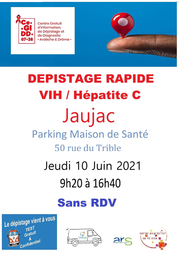 Dépistage rapide VIH et Hépatite C le 10 juin à Jaujac Le dépistage vient à vous ! Dépistage sans rendez-vous, gratuit et confidentiel du VIH et de l’ Hépatite C Jeudi 10 juin 2021 de 09h20 à 16h40 à Jaujac (Parking de la maison de santé) Livret d’accueil CEGIDD |
