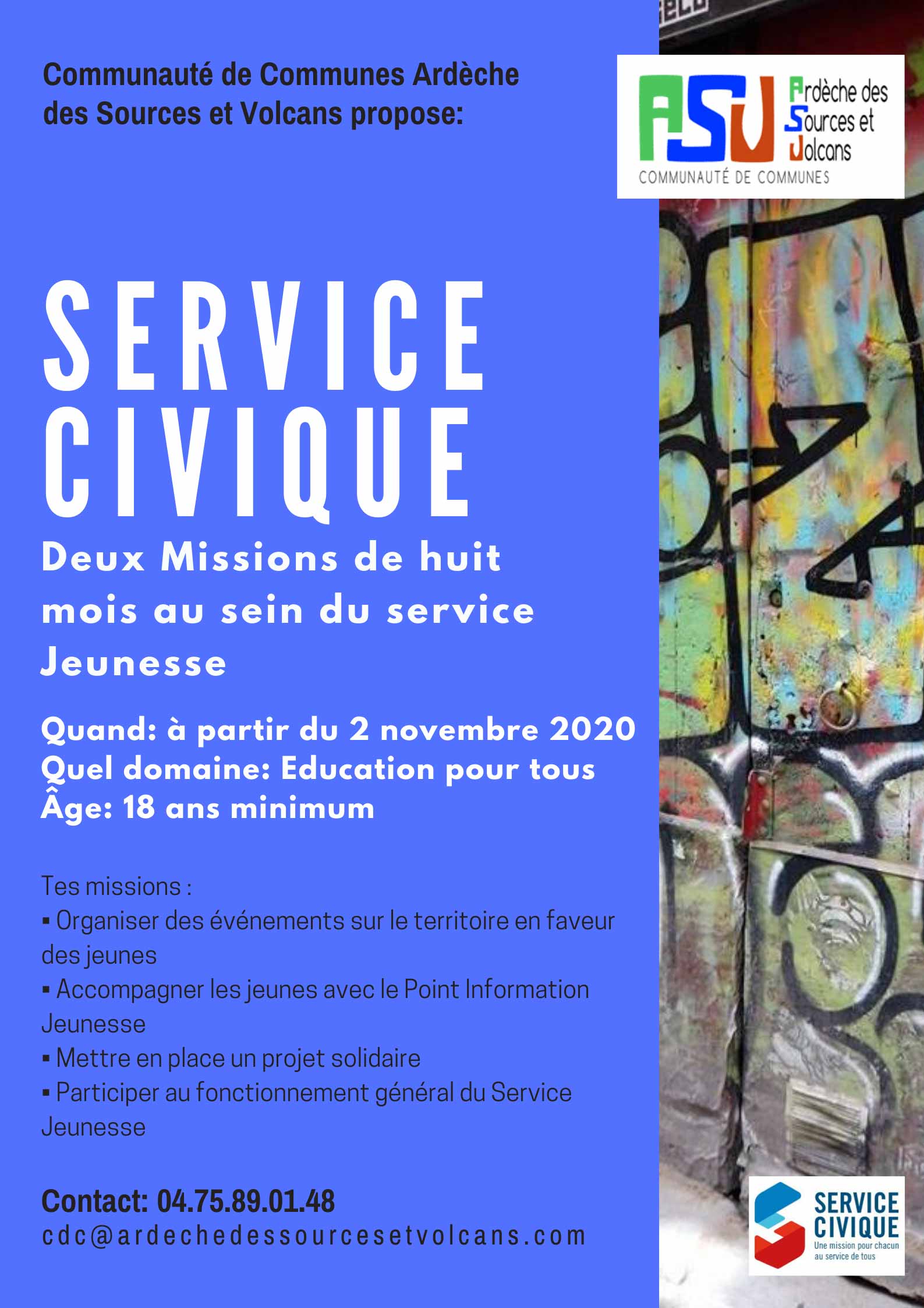 Devenez volontaire à la Communauté de Communes Ardèche des Sources et Volcans. Vous avez entre 18 et 25 ans et vous souhaitez vous engager au service du bien commun, donner de votre temps à la collectivité, vivre une expérience de volontariat en milieu professionnel comme une étape de vie, utile pour vous, pour les services d’accueil et pour la collectivité ?