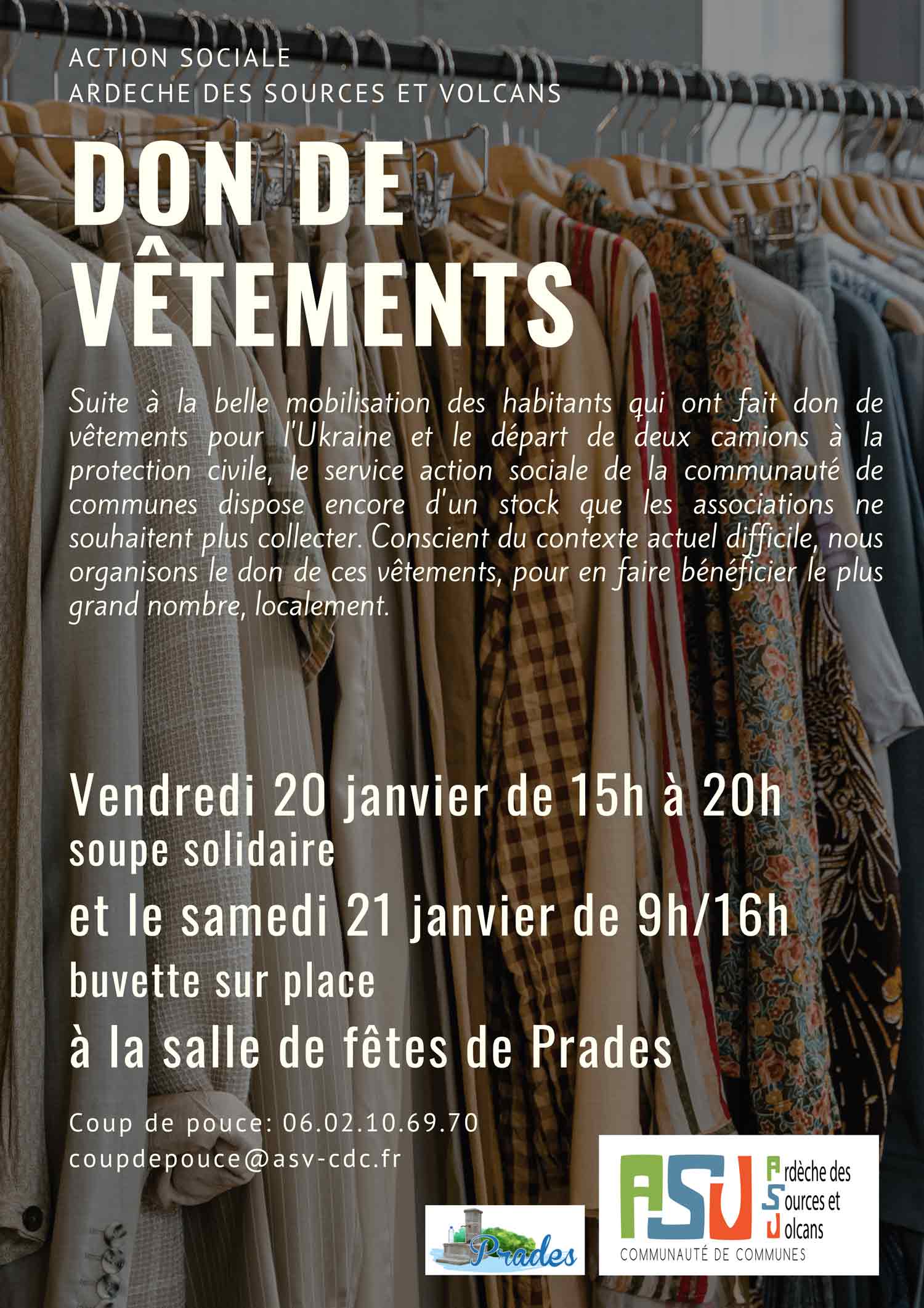 Suite à la belle mobilisation des habitants qui ont fait don de vêtements pour l’Ukraine et le départ de deux camions à la protection civile, le service action sociale de la communauté de communes dispose encore d’un stock que les associations ne souhaitent plus collecter. Conscient du contexte actuel difficile, nous organisons le don de ces vêtements, pour en faire bénéficier le plus grand nombre, localement.