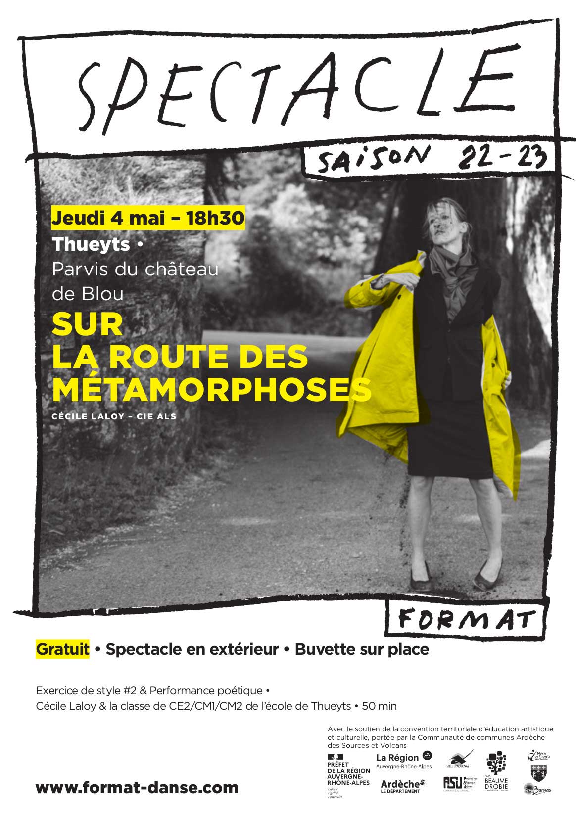 Dans le cadre de la convention territoriale d’éducation artistique et culturelle, portée par la Communauté de communes Ardèche des Sources et Volcans, le projet de territoire Sur la route des Métamorphoses se tisse à travers différents motifs (résidences, rencontres, interventions scolaires, présentation de spectacle, camps jeunes) entre 3 communes de la Haute-vallée de l’Ardèche : Mayres, Barnas & Thueyts. Plus particulièrement, Sur la route des Métamorphoses s’est arrimé à l’école de Thueyts pour sept journées dédiées à la création d’une performance de novembre 2022 à mai 2023.