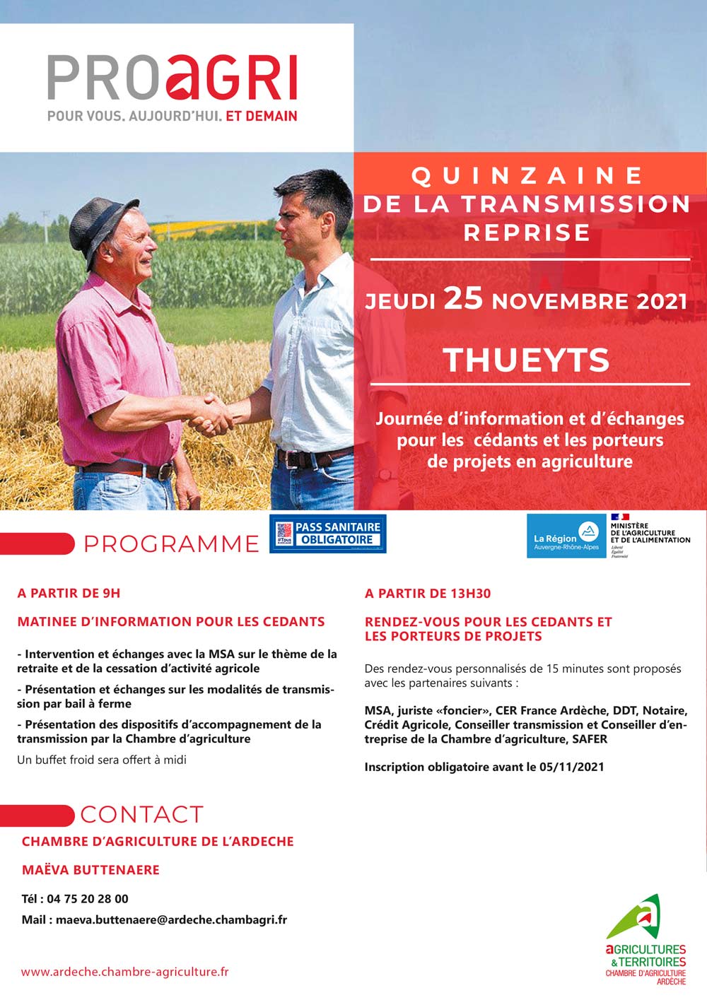 Dans le cadre de la Quinzaine de la Transmission Reprise, la Chambre d’agriculture de l’Ardèche propose une journée d’informations et d’échanges aux cédants et porteurs de projets en agriculture.