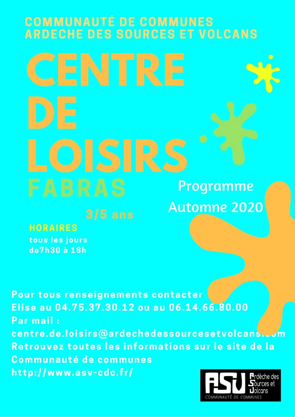 Toute l’équipe du centre de loisirs de la communauté de communes  » Ardèche des Sources et Volcans », se prépare à accueillir vos enfants pour cette nouvelle période du lundi 19 octobre au vendredi 30 octobre 2020 de 7h30 à 18h00.