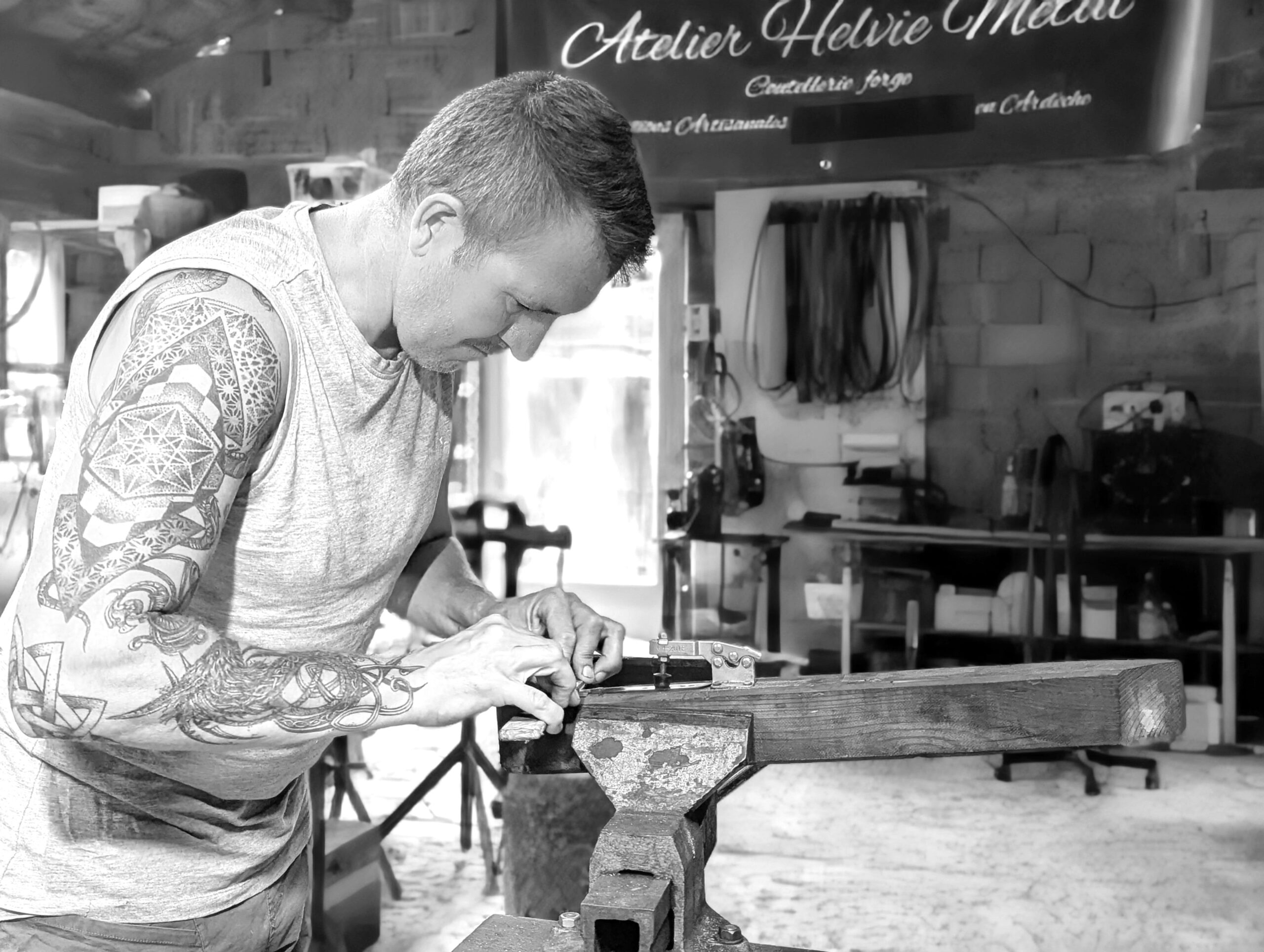 Philippe est un coutelier-forgeron passionné, créant à la main des couteaux, outils et objets artisanaux uniques. Il mêle matières et textures, s'inspirant de la nature, de la mythologie, de l'histoire et de la musique pour façonner ses œuvres.