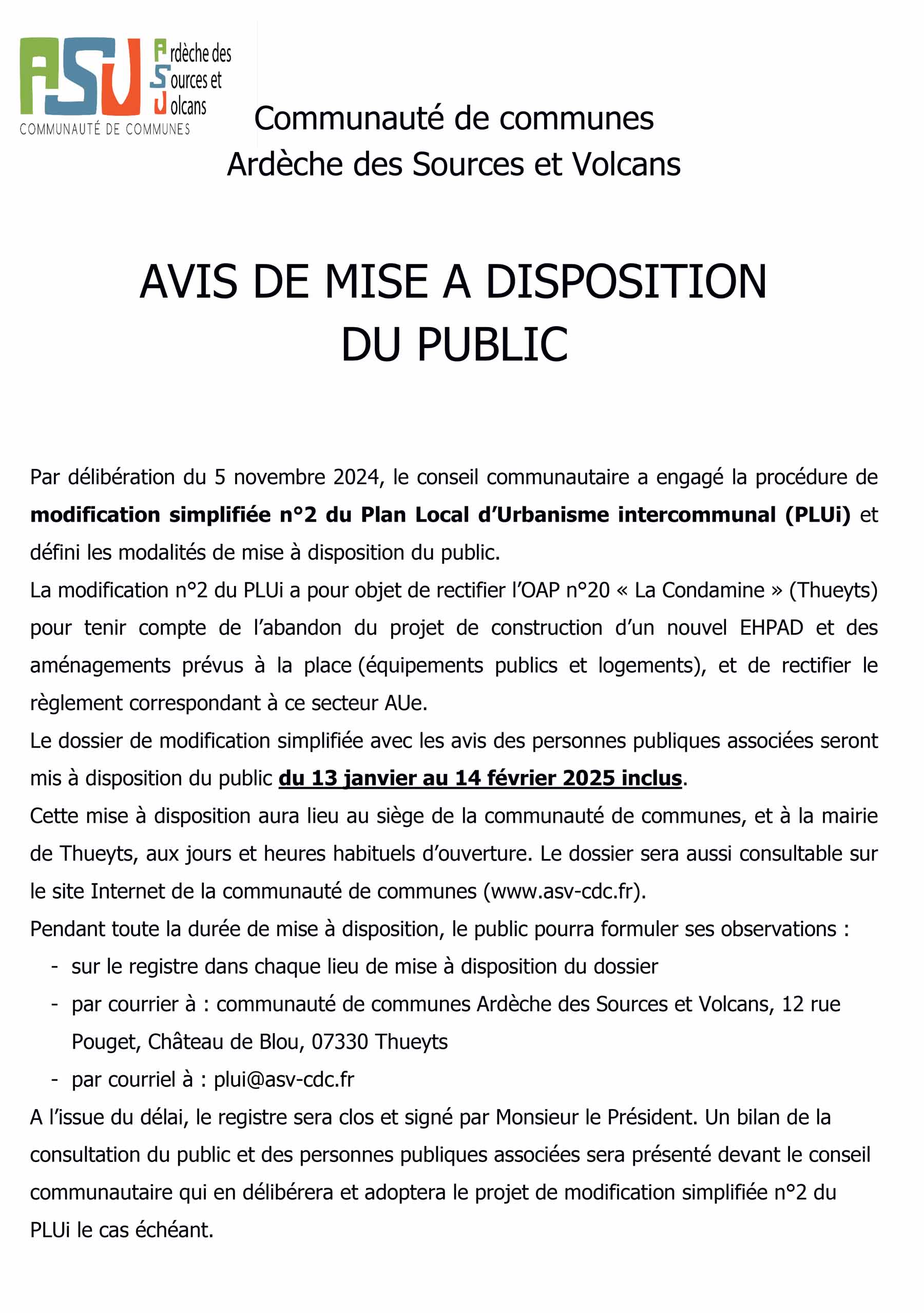 Cette mise à disposition aura lieu au siège de la communauté de communes, et à la mairie de Thueyts, aux jours et heures habituels d’ouverture. Le dossier sera aussi consultable sur le site Internet de la communauté de communes (www.asv-cdc.fr).