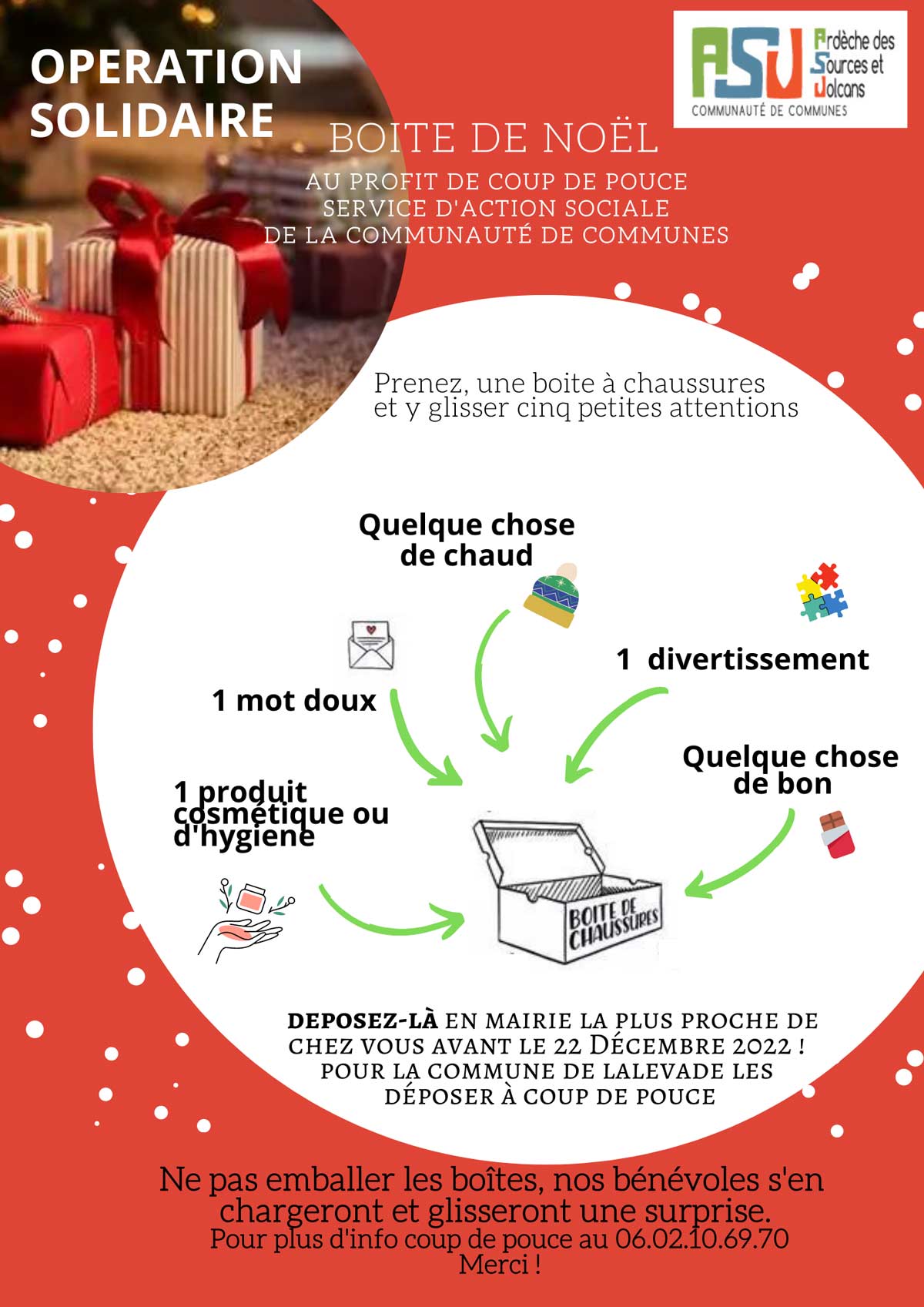 Déposez votre boite en mairie la plus proche de chez vous avant le 22 Décembre (Pour la commune de Lalevade les déposer à Coup de Pouce)