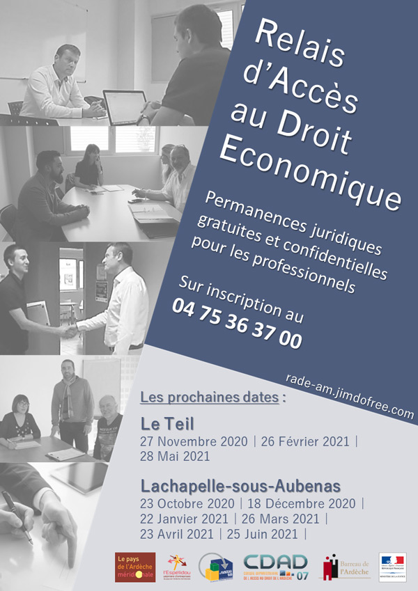 Il s’agit d’une permanence d’avocats du barreau de l’Ardèche pour les porteurs de projets, entrepreneurs, associations, collectivités, entrepreneurs salariés désirant aborder une question juridique avec un avocat (droit social, droit des sociétés, droit commercial, …). Cela peut concerner des interrogations sur un bail commercial, un contrat de prestations; des conditions générales de vente; un problème de paiement d’une prestation par un client, un conseil sur un statut juridique, une procédure de licenciement, …