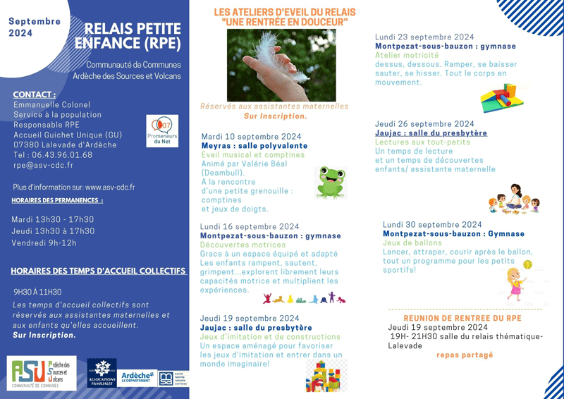 Programme Relais Petite Enfance – Septembre 2024 Le programme du Relais Petite Enfance (RPE) du mois de septembre est là ! Ateliers d’éveil pour une rentrée en douceur. Réservés aux assistantes maternelles – sur inscription. |