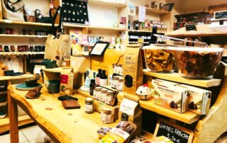 Nous gérons nous-même la boutique et la personne qui vous servira sera tantôt l’apiculteur, tantôt le maraîcher, tantôt l’épicier, tantôt la céramiste…Voici ce que vous pourrez trouver dans notre boutique : légumes, fromages, fruits, miel, céramique, savons, cosmétiques artisanaux, créations textiles, oeufs, châtaignes transformées, confitures, compotes, sorbets, escargots, viande de porc, tisanes, hydrolats, jus de fruits, sirops, bières, vins, pains, petite épicerie, vrac, légumes transformés…