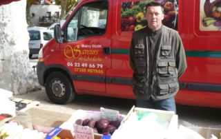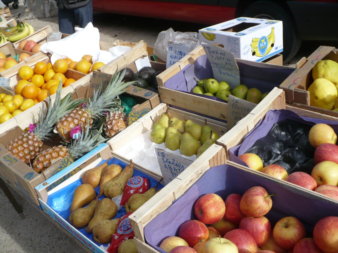 Commerce de détail sur les marchés, vente de fruits et légumes.