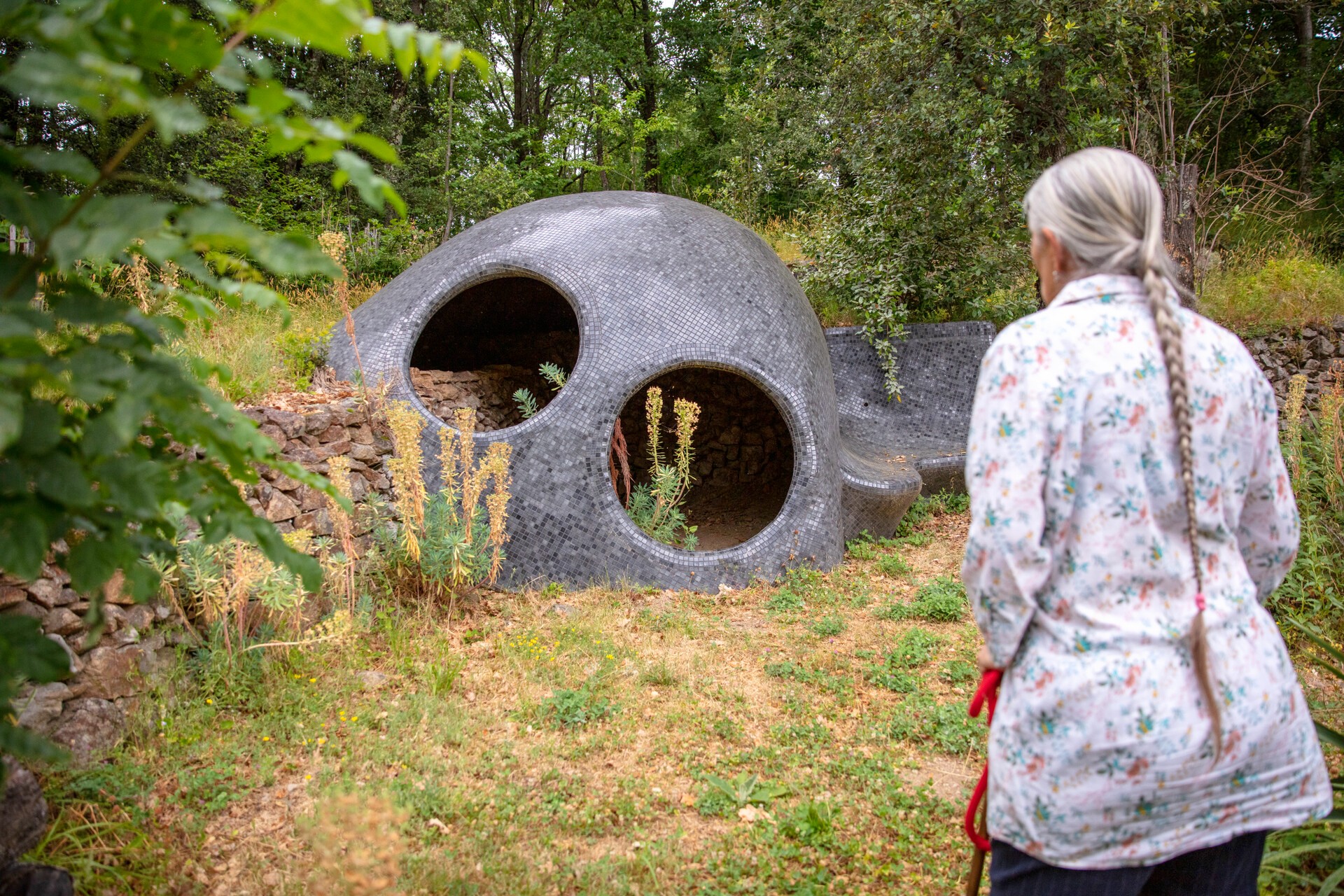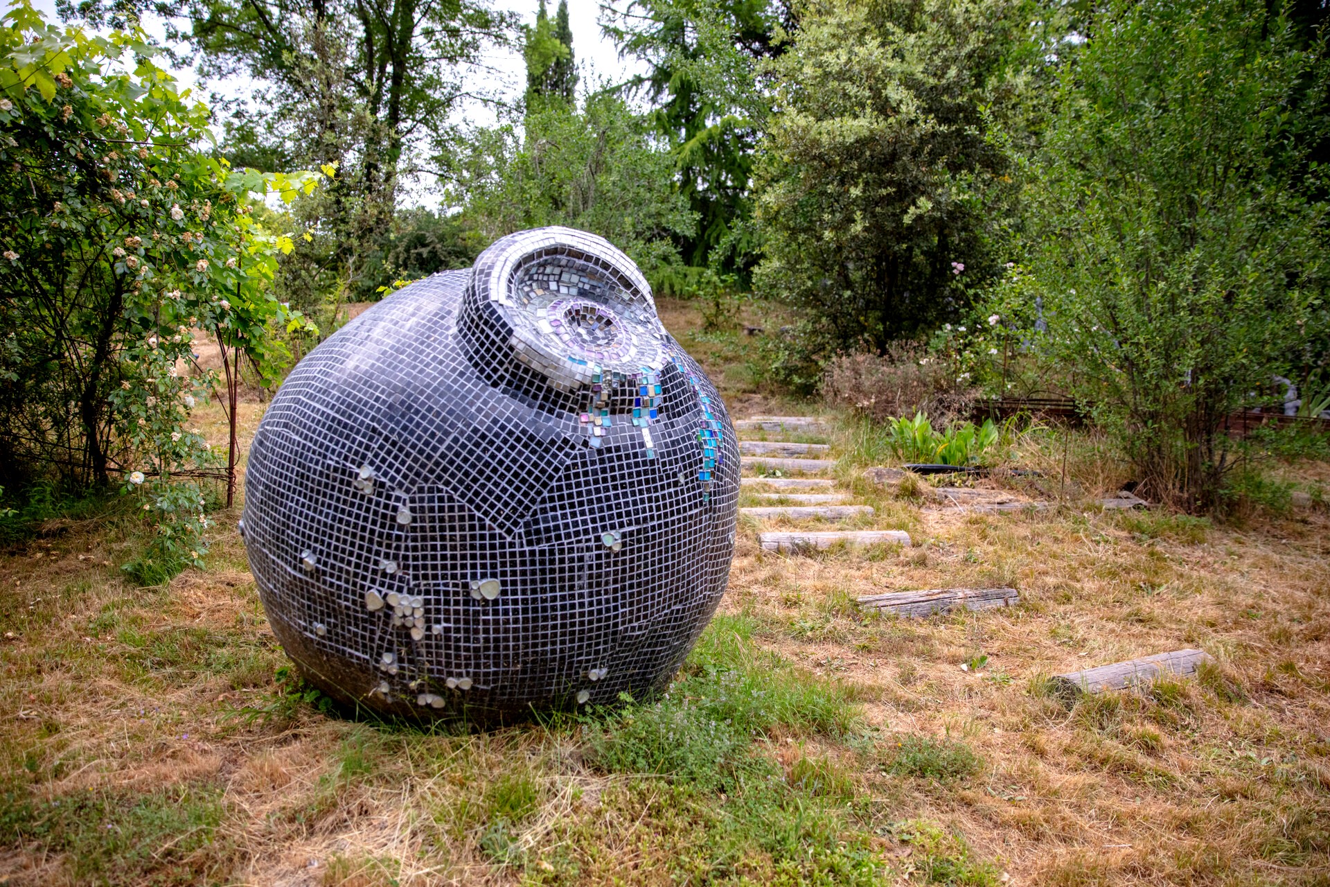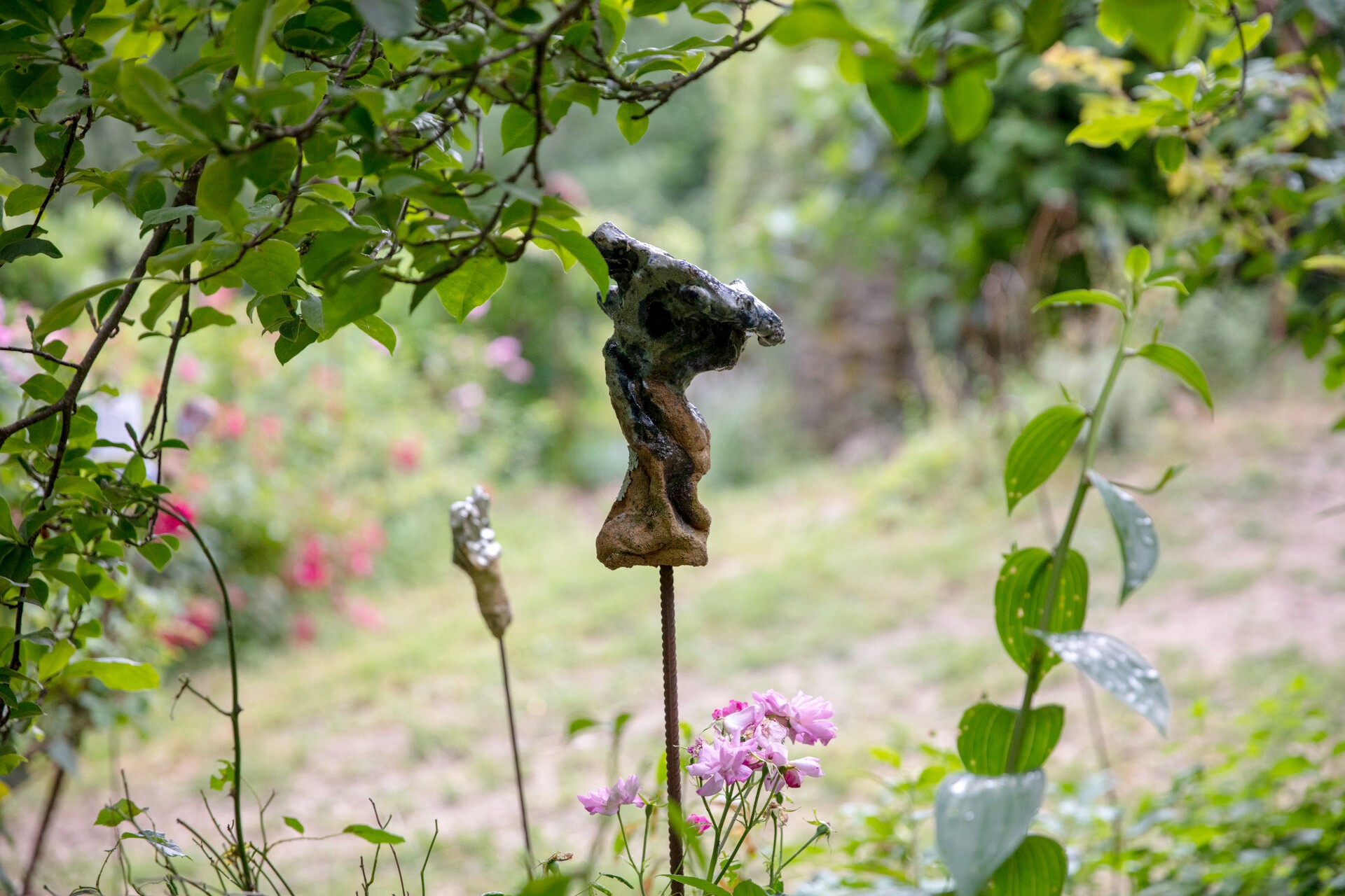 Plasticienne sculpteur, céramiste, Martine vit et expose depuis 1994 au Château du Pin. Ses œuvres fusionnent végétal et corps, évoquant mémoire et résilience à travers la matière et le feu. Ses sculptures monumentales en béton mosaïqué ornent les jardins