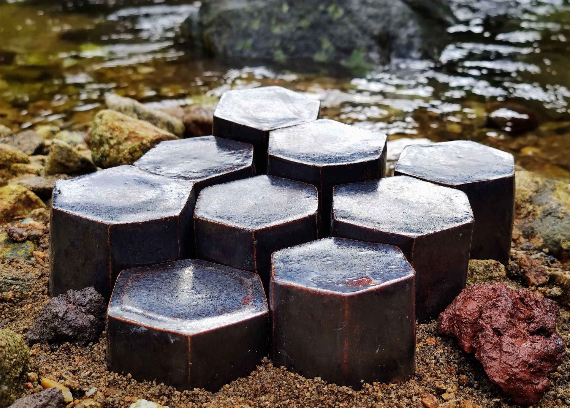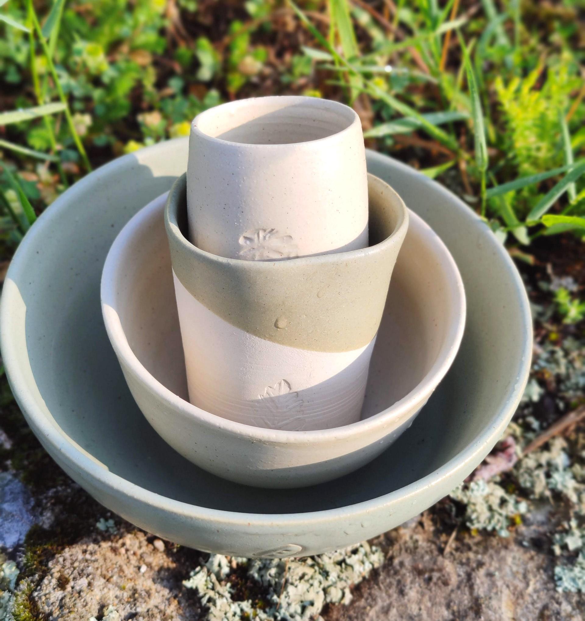 Mon travail est inspiré par les végétaux et les roches qui composent mon territoire pour produire des céramiques en grès les plus écologiques et locales possibles. Je travaille sur deux collections : - « Impressions végétales » : les feuilles et fleurs de mon hameau impriment l’argile et sont entourées d’un émail de faïence et de cendres de mon poêle à bois. - « Chaussée des géants » : les pièces en grès sont inspirées par les orgues basaltiques et décorées avec un émail de faïence noire et de basalte récolté localement.