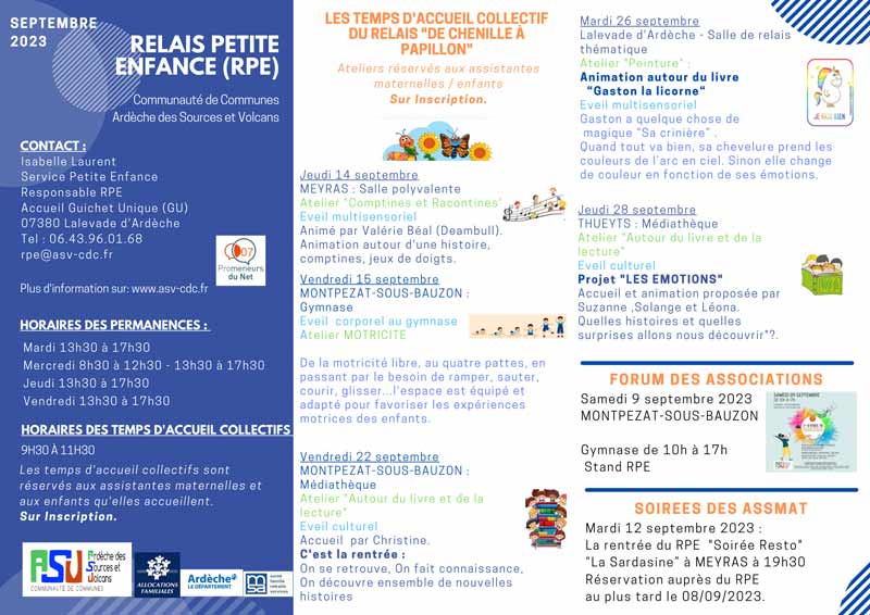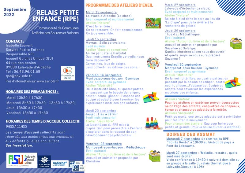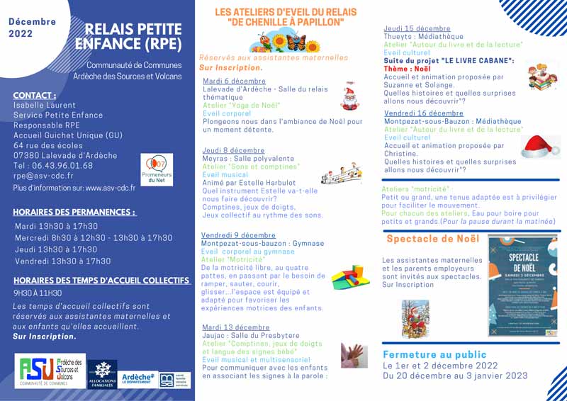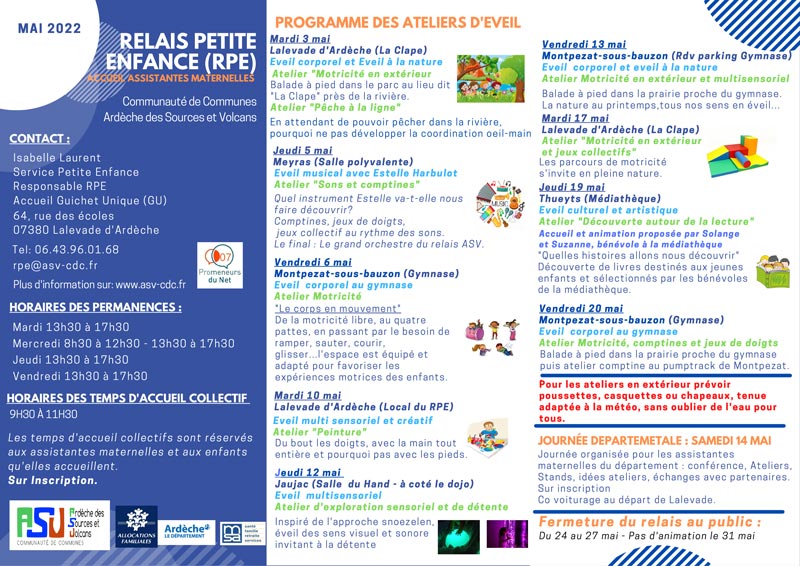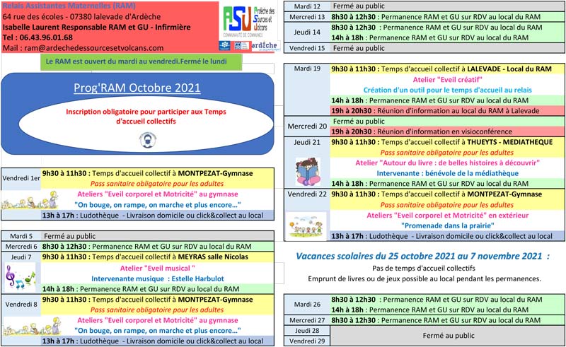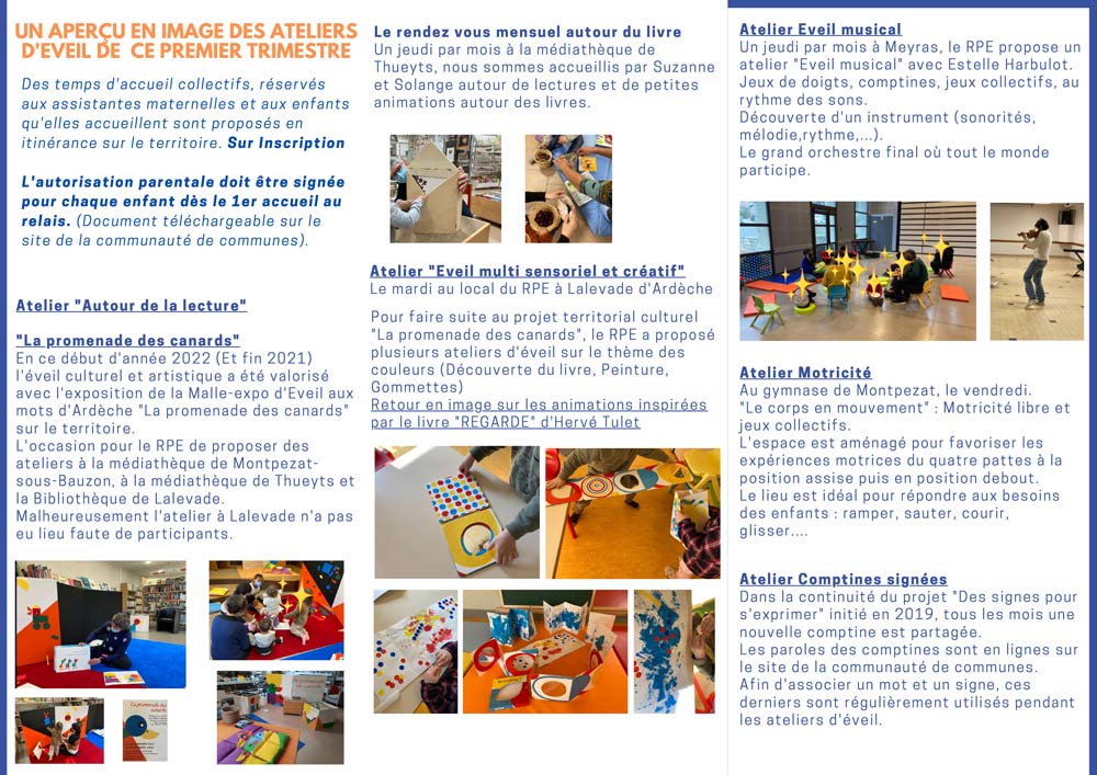 Temps collectifs à Thueyts, Lalevade d’Ardèche, Meyras, Jaujac et Montpezat-sous-Bauzon et permanence  Lalevade d’Ardèche.