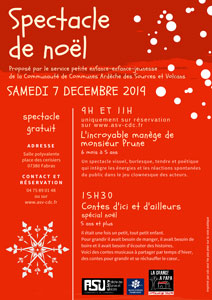 Le samedi 7 décembre 2019 : spectacle de noël de la communauté de communes Ardèche des sources et volcans.